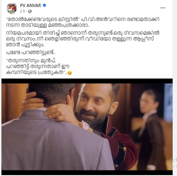 'ഒരു ദിവസമെങ്കിൽ ഒരു ദിവസം.. നീ ഞെളിഞ്ഞിരുന്ന് വീഡിയോ തള്ളുന്ന ഓഫീസ് ഞാൻ പൂട്ടിക്കും.. പണ്ടേ പറഞ്ഞിട്ടുണ്ട്.. 'തരുന്നതിനും മുൻപ്, പറഞ്ഞിട്ട് തരുന്നതാണ് ഈ കമ്പനിയുടെ പ്രത്യേകത'; ഫേസ്ബുക്ക് പോസ്റ്റുമായി പി വി അൻവർ എംഎൽഎ; 'മരണ മാസ്സെന്ന്' പറഞ്ഞ് കയ്യടികളോടെ സൈബർ സഖാക്കൾ!