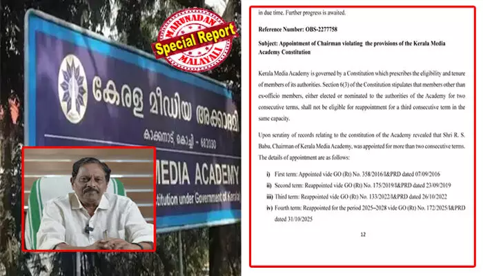 മീഡിയ അക്കാഡമി ഭരണഘടനയിലെ 6(3) വകുപ്പ് പ്രകാരം, ഒരു അംഗത്തിന് തുടര്ച്ചയായി രണ്ട് ടേമിലധികം (Consecutive Terms) ഭാരവാഹിത്വത്തില് തുടരാന് അവകാശമില്ല. എന്നാല് ആര്.എസ്. ബാബുവിന്റെ കാര്യത്തില് ഈ നിയമം പാടേ അവഗണിക്കപ്പെട്ടു.