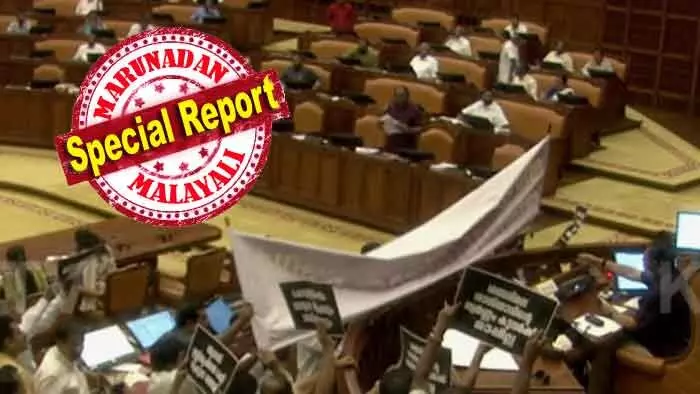 ചോദ്യോത്തര വേളയില് പ്രതിപക്ഷ നേതാവ് വി.ഡി.സതീശന് വിഷയം ഉന്നയിച്ചു. സ്വര്ണം കാണാതായ സംഭവത്തില് ദേവസ്വം മന്ത്രിയും ദേവസ്വം പ്രസിഡന്റും രാജിവയ്ക്കണമെന്നു പ്രതിപക്ഷ നേതാവ് ആവശ്യപ്പെട്ടു. എന്നാല്, അംഗങ്ങളെ സ്പീക്കര് ചോദ്യം ഉന്നയിക്കാനായി ക്ഷണിച്ചു. ഇതോടെ പ്രതിപക്ഷം പ്രതിഷേധ മുദ്രാവാക്യങ്ങള് എഴുതിയ ബാനറും ബോര്ഡുകളുമായി നടുത്തളത്തിലിറങ്ങി പ്രതിഷേധിച്ചു. സ്പീക്കറെ മറച്ച് ബാനര് പിടിച്ചു. മന്ത്രിമാര് ഉള്പ്പെടെയുള്ള ഭരണപക്ഷവും കസേരകളില്നിന്ന് എഴുന്നേറ്റു. ചോദ്യോത്തരവേള തടസ്സപ്പെടുത്തുന്ന പ്രവണത രാജ്യത്ത് ഒരിടത്തും ഇല്ലെന്നും ഇത് ശരിയായ രീതിയല്ലെന്നും ധനമന്ത്രി കെ.എന്.ബാലഗോപാല് പറഞ്ഞു. പ്രതിപക്ഷ നേതാവ് അംഗങ്ങളെ നിയന്ത്രിക്കണമെന്നും മന്ത്രി ആവശ്യപ്പെട്ടു.
