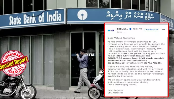 ഡോളര് കിട്ടാനില്ല! മാലദ്വീപില് ജോലി ചെയ്യുന്ന പ്രവാസികള്ക്ക് പണമയക്കാനുള്ള പരിധി വെട്ടിക്കുറച്ച് എസ്.ബി.ഐ; ഒരു മാസം അയക്കാവുന്ന പരമാവധി തുക 150 ഡോളര് മാത്രം; നാട്ടിലേക്ക് പണം അയയ്ക്കാന് സ്വകാര്യ ഏജന്റുമാരെ ആശ്രയിക്കുമ്പോള് ഭീമമായ നഷ്ടം; കേന്ദ്ര സര്ക്കാര് ഇടപെടണമെന്ന് ഇന്ത്യന് പ്രവാസികള്