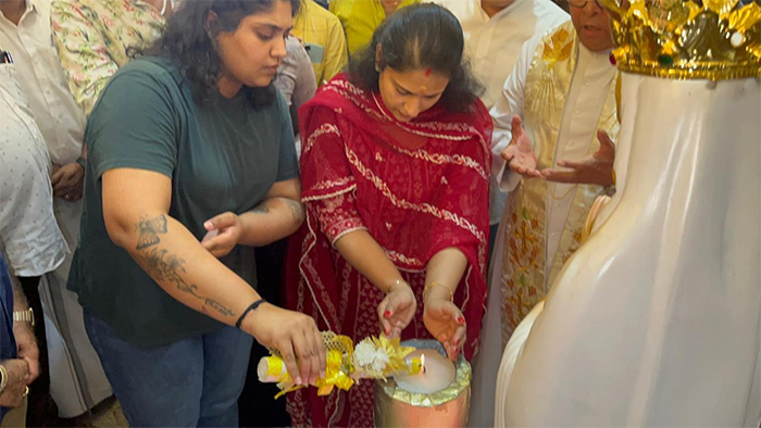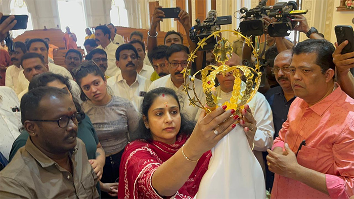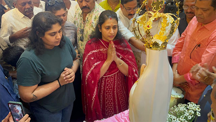 തൃശ്ശൂർ: ലൂർദ്ദ് മാതാ ദേവാലയത്തിൽ സ്വർണ്ണ കിരീടം സമർപ്പിച്ച് സുരേഷ് ഗോപിയും കുടുംബവും. മകളുടെ വിവാഹത്തിന് മുന്നോടിയായുള്ള നേർച്ചയുടെ ഭാഗമായാണ് സ്വർണ്ണ കിരീടം സമർപ്പിച്ചത്. ആഴ്ചകൾക്ക് മുമ്പ് പള്ളി സന്ദർശിച്ച സുരേഷ് ഗോപി തനിക്ക് ഇത്തരത്തിൽ ഒരു ആഗ്രഹമുണ്ടെന്ന് പള്ളി അധികൃതരെ അറിയിക്കുകയായിരുന്നു.