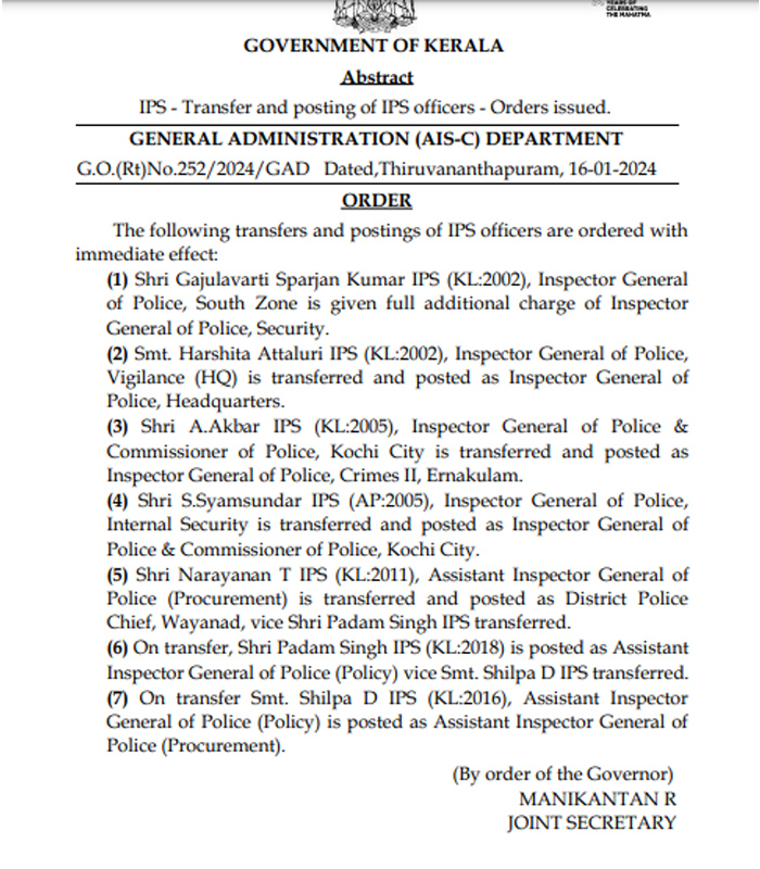 പ്രൊക്യുർമെന്റ് വിഭാഗം അസിസ്റ്റന്റ് ഐജി നാരായണൻ ടിയെ വയനാട് ജില്ലാ പൊലീസ് മേധാവിയായി മാറ്റി നിയമിച്ചു. വയനാട് പൊലീസ് മേധാവിയായിരുന്ന പദം സിങ്ങിനെ പോളിസി വിഭാഗം അസിസ്റ്റന്റ് ഐജിയായി നിയമിച്ചു. പോളിസി വിഭാഗം അസിസ്റ്റന്റ് ഐജിയായിരുന്ന ഡി ശിൽപ്പയാണ് പ്രൊക്യുർമെന്റ് വിഭാഗം അസിസ്റ്റന്റ് ഐജി. ഉന്നത ഉദ്യോഗസ്ഥരെ കൂടാതെ അഞ്ച് അഡീഷണൽ എസ്പിമാരെയും 114 ഡിവൈഎസ്പിമാരെയും സ്വന്തം ജില്ല വിട്ട് മാറ്റികൊണ്ട് ഉത്തരവിറങ്ങി.