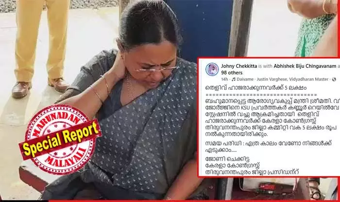 ബഹുമാനപ്പെട്ട ആരോഗ്യവകുപ്പ് മന്ത്രി ശ്രീമതി. വീണ ജോര്ജ്ജിനെ ഗടഡ പ്രവര്ത്തകര് കണ്ണൂര് റെയില്വേ സ്റ്റേഷനില് വച്ചു ആക്രമിച്ചതായി തെളിവ് ഹാജരാക്കുന്നവര്ക്ക് കേരളാ കോണ്ഗ്രസ്സ് തിരുവനന്തപുരം ജില്ലാ കമ്മിറ്റി വക 5 ലക്ഷം രൂപ നല്കുന്നതായിരിക്കും.