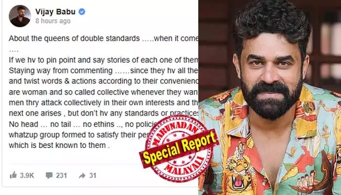 'ഇരട്ടത്താപ്പിന്റെ റാണിമാര്' എന്നാണ് ഡബ്ല്യൂസിസി അംഗങ്ങളെ വിജയ് ബാബു വിശേഷിപ്പിച്ചിരിക്കുന്നത്. പോസ്റ്റില് എവിടെയും ഈ സംഘടനയുടെ പേരെടുത്ത് പറയുന്നില്ലെങ്കിലും സൂചനകള് എല്ലാം ഡബ്ല്യൂസിസിയിലേക്കാണ് വിരല് ചൂണ്ടുന്നത്. പുരുഷന്മാരെ ആക്രമിക്കണം എന്ന് തോന്നുമ്പോള് അവര് ഒരു 'കൂട്ടായ്മ' ആയി മാറുന്നു. സ്വന്തം താല്പ്പര്യങ്ങള്ക്കായി അവര് ഒന്നിച്ചുനിന്ന് ആക്രമിക്കുകയും, അത് കഴിഞ്ഞാല് അടുത്ത പ്രശ്നം ഉണ്ടാകുന്നത് വരെ പിരിഞ്ഞുപോവുകയും ചെയ്യുന്നു. എന്നാല് അവര്ക്ക് സ്വന്തമായി യാതൊരു മാനദണ്ഡങ്ങളോ രീതികളോ ഇല്ലെന്നാണ് വിജയ് ബാബു ഫേസ്ബുക്കില് കുറിച്ചത്.