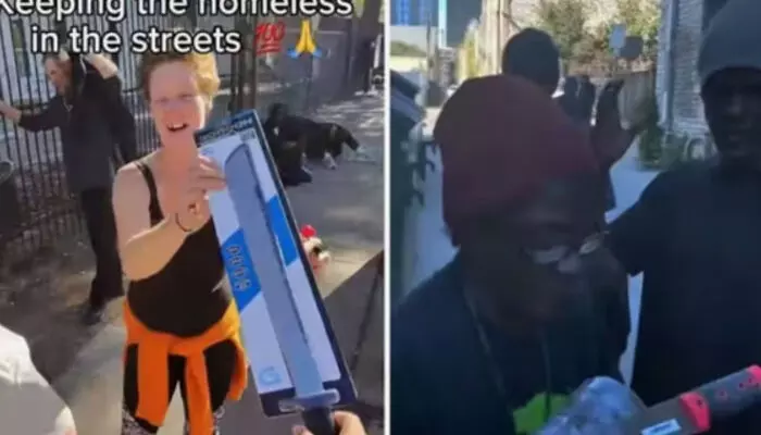 തെരുവിൽ കഴിയുന്നവരുടെ ഇടയിലേക്ക് ഒരാളുടെ വരവ്; ഭക്ഷണമെന്ന് കരുതി ഓടിയെത്തിയ ഹോംലെസ്സ്; അടുത്തെത്തിയതും വാളും വിസ്കി കുപ്പിയും നൽകി ടിക്ടോക്കർ; വ്യാപക വിമർശനം