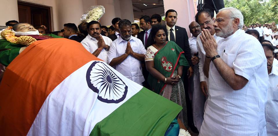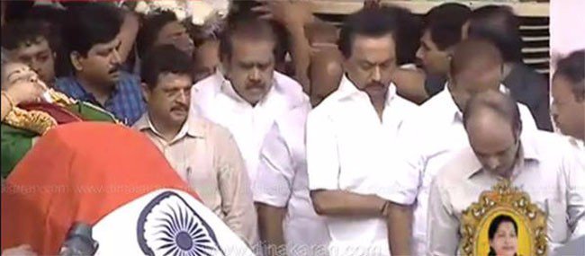 തമിഴ്നാടിന്റെ വിവിധ ഭാഗങ്ങളിൽനിന്ന് ആയിരക്കണക്കിന് ജനങ്ങളാണ് ജയലളിതയുടെ മൃതദേഹം അവസാനമായി ഒരുനോക്കു കാണുന്നതിന് ചെന്നൈയിലേയ്ക്ക് ഒഴുകുന്നത്. പ്രതിപക്ഷ നേതാവ് സ്റ്റാലിനും മറ്റ് ഡിഎംകെ നേതാക്കളും ജയക്ക് അന്തിമോപചാരം അർപ്പിക്കാൻ എത്തിയതും ശ്രദ്ധേയമായി. ഒ പനീർശെൽവത്തെ കണ്ട് സംസാരിച്ച ശേഷമാണ് സ്റ്റാലിൻ മടങ്ങിയത്. രാജാജിഹാളിൽ പൊതുദര്ശനത്തിന് വച്ച് മൃതദേഹത്തിൽ മുഖ്യമന്ത്രി പനീർ ശെൽവമാണ് ആദ്യം അന്തിമോപചാരം അർപ്പിച്ചത്. വിവിധ നേതാക്കളും പ്രമുഖരും അന്തിമോപചാരം അർപ്പിക്കുന്നതിനായി വന്നുകൊണ്ടിരിക്കുകയാണ്. പ്രധാനമന്ത്രി നരേന്ദ്ര മോദി ചെന്നൈയിൽ എത്തിയിട്ടുണ്ട്. നിരവധി കേന്ദ്ര മന്ത്രിമാരും നേതാക്കളും മുഖ്യമന്ത്രിമാരും സംസ്കാര ചടങ്ങുകൾക്ക് എത്തും.