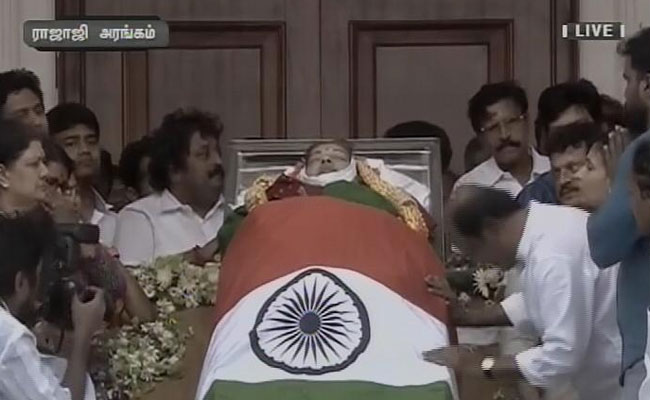 ഇന്നലെ അപ്പോളോ ആശുപത്രിയിൽനിന്ന് ജയലളിതയുടെ മൃതദേഹം വസതിയായ പോയസ് ഗാർഡനിൽ എത്തിച്ചിരുന്നു. അവിടെനിന്നാണ് രാജാജി ഹാളിലേയ്ക്ക് മാറ്റിയത്. ഇവിടെ പൊതു ദർശനം വൈകുന്നേരം വരെ തുടരും. തമിഴ്നാടിന്റെ ഉൾപ്രദേശങ്ങളിലടക്കം ആയിരക്കണക്കിനു പേരാണ് എത്തിക്കൊണ്ടിരിക്കുന്നത്. ഇതോടെ വലിയ ജനസാഗരമാണ് രാജാജി ഹാളിനു പരിസരത്ത് രൂപപ്പെട്ടിരിക്കുന്നത്. പലപ്പോഴും പൊലീസിന് ജനങ്ങളെ നിയന്ത്രിക്കാനാകാത്ത സാഹചര്യമാണുള്ളത്.