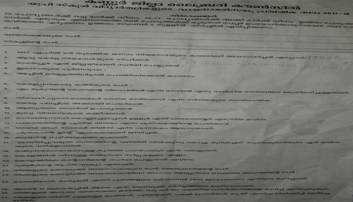 ആപ്പിൾ വെള്ളത്തിലിട്ടാൽ പൊങ്ങിക്കിടക്കാൻ കാരണം?ഉത്തരമറിയില്ലെങ്കിൽ 24 ാം ചോദ്യത്തിലേക്ക് ; ദേശാഭിമാനി പത്രത്തിന്റെ ഒക്ടോബർ ഏഴിലെ മുഖപ്രസംഗം എന്തിനെ കുറിച്ചാണ്? കണ്ണൂർ ജില്ലാ ലൈബ്രറി കൗൺസിൽ നടത്തിയ വായനാമൽസരത്തിലെ രസകരമായ ചോദ്യത്തിന് കുട്ടികൾ കണ്ടെത്തിയ ഉത്തരം ഇങ്ങനെ..