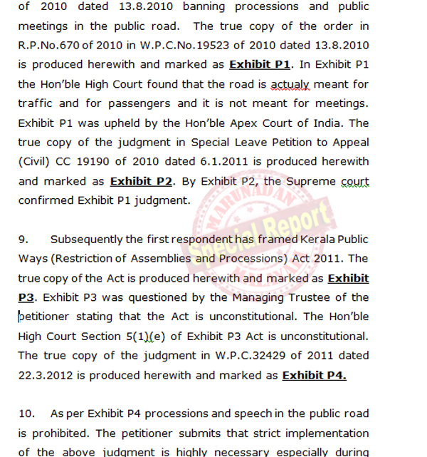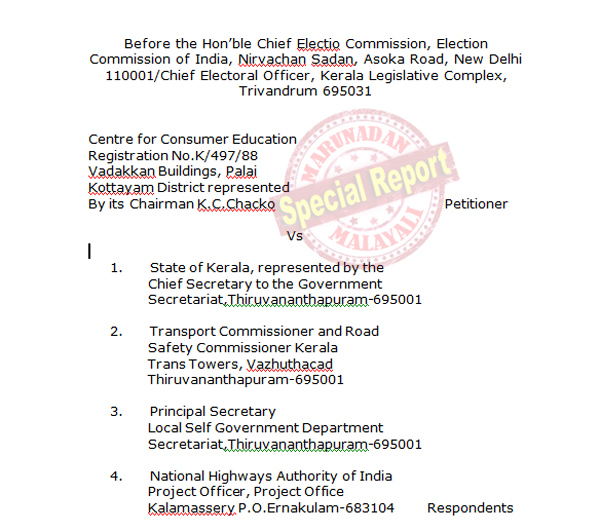 കോട്ടയത്തെ സെന്റർ ഫോർ കൺസ്യൂമർ എഡ്യൂക്കേഷനാണ് രാഷ്ട്രീയക്കാരെ സംബന്ധിച്ചടത്തോളം അതീവ പ്രാധാന്യമർഹിക്കുന്ന ഈ ഹർജി സമർപ്പിച്ചിരിക്കുന്നത്. അഡ്വ. ജീവൻ മാത്യു മനയാനി മുഖേനെയാണ് പരാതി നൽകിയത്. മുൻകാലങ്ങളിൽ കേരള ഹൈക്കോടതിയിൽ നിന്നും അടക്കം പാതയോരങ്ങളിൽ യോഗം സംഘടിപ്പിക്കുന്നതിന് നിരോധനമുള്ള കാര്യം ചൂണ്ടിക്കാട്ടിയാണ് ഇലക്ഷൻ കമ്മീഷന് പരാതി നൽകിയിരിക്കുന്നത്. കോടതി വിധികൾ പാലിക്കുന്ന വിധത്തിൽ തെരഞ്ഞെടുപ്പിലും കർശന നിലപാട് സ്വീകരിക്കണമെന്നാണ് ഹർജിക്കാരന്റെ ആവശ്യം. കേരളാ ചീഫ് സെക്രട്ടറി, ട്രാൻസ് പോർട്ട് കമ്മീഷർ, തദ്ദേശ സ്വയംഭരണ വകുപ്പ് പ്രിൻസിപ്പൽ സെക്രട്ടറി, നാഷണൽ ഹൈവേസ് അതോരിറ്റി ഓഫ് ഇന്ത്യ എന്നിവരെ എതിർ കക്ഷികളാക്കിയാണ് ഹർജി നൽകിയത്.