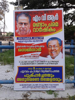 കണ്ണൂർ: കാൽ നൂറ്റാണ്ടിലേറെക്കാലം രാഷ്ട്രീയ എതിരാളിയായി കണ്ട് എം വി രാഘവന്റെ രണ്ടാം ചരമവാർഷിക ദിനം ഉദ്ഘാടനം ചെയ്യാൻ നാളെ മുഖ്യമന്ത്രി പിണറായി വിജയനെത്തുന്നു. സി.എം. പി. അരവിന്ദാക്ഷൻ വിഭാഗം സംഘടിപ്പിക്കുന്ന പരിപാടിയിൽ സിപിഐ.(എം.) ജില്ലാ സെക്രട്ടറിയും പ്രസംഗകരുടെ നിരയിലുണ്ട്. 1987 ൽ ബദൽരേഖയുടെ പേരിൽ സി.എം. പി. രൂപീകരിച്ച് പുറത്തുപോകേണ്ടി വന്ന എം. വി. രാഘവനും കുടുംബത്തിനും നേരിടേണ്ടി വന്ന പീഡനത്തിന് ചരിത്രം മാപ്പുകൊടുക്കില്ലെന്നു കരുതുന്നവരാണു സാക്ഷികളായ കണ്ണൂർക്കാരിൽ പലരും. രാഘവൻ സ്ഥാപിച്ച കണ്ണൂർ എ.കെ.ജി. സ്മാരക സഹകരണാശുപത്രിയും പരിയാരം മെഡിക്കൽ കോളേജും സിപിഐ.(എം.) പിടിച്ചെടുത്തതോടെ എല്ലാം അദ്ദേഹത്തിന് പുറത്തുനിന്നു നോക്കി കാണേണ്ടി വന്നു. ഇത്രയേറെക്കാലം ഒരു പാർട്ടി മുൾമുനയിലാക്കി നിർത്തിയ വ്യക്തി കേരളചരിത്രത്തിൽ മാത്രമല്ല രാജ്യത്തു തന്നെ അപൂർവ്വമാണ്. അത്രയേറെ സഹിക്കേണ്ടി വന്നിരുന്നു എം വി ആറിന്. സി.എംപി. പിറന്നപ്പോൾ എ.കെ. ജി. ആശുപത്രി പിടിച്ചെടുക്കാൻ സിപിഐ.(എം.) നടത്തിയ നീക്കം കണ്ണൂരിന് മറക