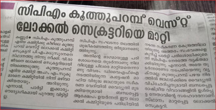 മധുസൂദനനെ മാറ്റിയത് മനോരമ അടക്കം റിപ്പോർട്ട് ചെയ്തിട്ടുണ്ട്. വി.രാജീവനാണ് പുതിയ ലോക്കൽസെക്രട്ടറി. എന്നാൽ പാർട്ടി ഈക്കാര്യം ഔദ്യോഗികമായി കീഴ്ഘടകങ്ങളിൽ റിപ്പോർട്ടു ചെയ്തിട്ടില്ല. സ്വർണക്കടത്ത് പൊട്ടിക്കൽ സംഘവുമായി ബന്ധപ്പെട്ട ചില തർക്കങ്ങൾ സി.പി. എം വെസ്റ്റ്ലോക്കൽ കമ്മിറ്റി നേതാക്കളും ഏരിയാകമ്മിറ്റിയംഗങ്ങളും പാർട്ടി കേന്ദ്രങ്ങളിൽ മധ്യസ്ഥത പറഞ്ഞു തീർക്കുന്ന സംഭവങ്ങളുണ്ടായിട്ടുണ്ടെന്ന് സി.പി. എം ജില്ലാ നേതൃത്വം കണ്ടെത്തിയിട്ടുണ്ട്. ഇതുകൂടാതെ അഞ്ചുമാസം മുൻപ് ഡി.വൈ. എഫ്. എ സ്വർണക്കടത്ത്-ക്വട്ടേഷൻ സംഘങ്ങൾക്കെതിരെ നടത്തിയ കാൽ നട പ്രചരണജാഥയ്ക്കു പഴയ നിരത്തിൽ നൽകിയ സ്വീകരണത്തിനിടെ ഫ്യൂസ് ഊരിയതുമായി ബന്ധപ്പെട്ട വിവാദവും നടപടിക്ക് കാരണമായിട്ടുണ്ടെന്നാണ് സൂചന.