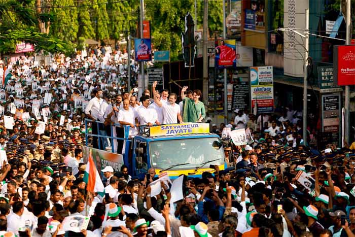 അതേസമയം, വയനാട്ടുകാർക്ക് മറ്റാരെക്കാളും നന്നായി രാഹുൽ ഗാന്ധിയെ മനസ്സിലാക്കാൻ സാധിച്ചെന്നു പ്രിയങ്കാ ഗാന്ധി പറഞ്ഞു. രാഹുൽ ധൈര്യശാലിയാണ്. ഭരണകൂടം അദ്ദേഹത്തെ നിശബ്ദനാക്കാൻ ശ്രമിക്കുന്നു. ചോദ്യം ചോദിക്കുക എന്നത് ജനപ്രതിനിധിയുടെ കടമയാണ്. പ്രധാനമന്ത്രി ഉൾപ്പെടെ മന്ത്രിമാരും എംപിമാരും ഒരാളെയാണ് ആക്രമിക്കാൻ ശ്രമിക്കുന്നതെന്നും പ്രിയങ്ക പറഞ്ഞു.