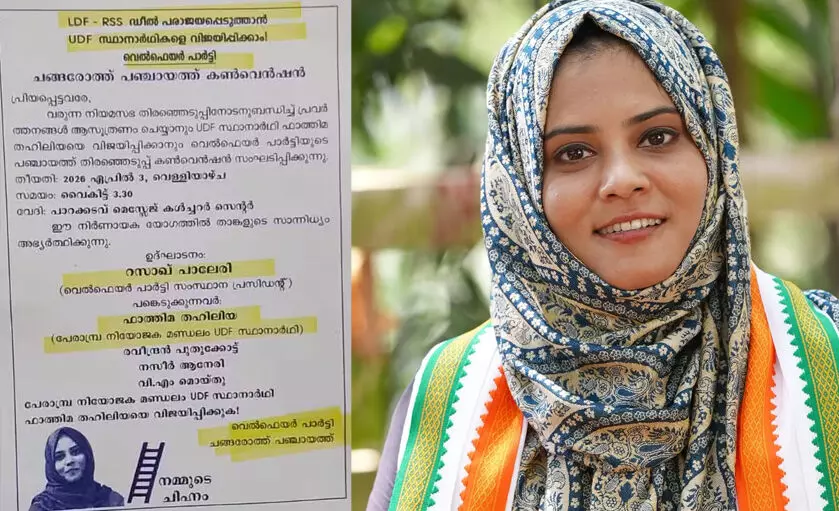 പേരാമ്പ്ര: യുഡിഎഫ് സ്ഥാനാര്ത്ഥി ഫാത്തിമ തെഹ്ലിയക്കായി വെല്ഫെയര് പാര്ട്ടി പേരാമ്പ്ര ചങ്ങരോത്ത് പഞ്ചായത്തില് പ്രത്യേക കണ്വന്ഷന് സംഘടിപ്പിച്ചു. സംസ്ഥാന അധ്യക്ഷന് റസാഖ് പാലേരി പങ്കെടുത്ത ചടങ്ങില് ഫാത്തിമ തെഹ്ലിയ എത്തുമെന്ന് നേരത്തെ അറിയിച്ചിരുന്നു. ഇതിനായി നോട്ടീസുകള് അടിച്ച് വിപുലമായ പ്രചാരണവും നടത്തിയിരുന്നു. എന്നാല്, കണ്വന്ഷന് നടക്കാനിരുന്ന സ്ഥലത്തേക്ക് മാധ്യമങ്ങള് എത്തിയതോടെ സ്ഥാനാര്ത്ഥി പരിപാടിയില് നിന്ന് പിന്മാറുകയായിരുന്നു.
