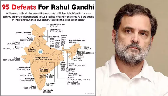 'രാഹുല് ഗാന്ധിയുടെ മറ്റൊരു തെരഞ്ഞെടുപ്പ്, മറ്റൊരു പരാജയം! തെരഞ്ഞെടുപ്പിലെ സ്ഥിരതയ്ക്ക് അവാര്ഡുകള് ഉണ്ടായിരുന്നെങ്കില്, അദ്ദേഹം അവയെല്ലാം തൂത്തുവാരുമായിരുന്നു'- എന്നാണ് ബി.ജെ.പിയുടെ പരിഹാസം. രാഹുല് ഗാന്ധി നയിച്ച തെരഞ്ഞെടുപ്പുകളില് കോണ്ഗ്രസിന്റെ 95 പരാജങ്ങളാണ് മാപ്പില് അയാളപ്പെടുത്തിയിരിക്കുന്നത്. ഹിമാചല് പ്രദേശ് (2007, 2017), പഞ്ചാബ് (2007, 2012, 2022), ഗുജറാത്ത് (2007, 2012, 2017, 2022), മധ്യപ്രദേശ് (2008, 2013, 2018, 2023), മഹാരാഷ്ട്ര (2014, 2019, 2024), ഡല്ഹി, ഹരിയാന, ഉത്തര്പ്രദേശ്, ബിഹാര് തുടങ്ങിയ സംസ്ഥാനങ്ങളിലെ തെരഞ്ഞെടുപ്പുകളും ഇതില്പ്പെടുന്നു. വടക്കുകിഴക്കന് സംസ്ഥാനങ്ങളിലെയും ദക്ഷിണേന്ത്യന് സംസ്ഥാനങ്ങളിലെയും കേന്ദ്രഭരണ പ്രദേശങ്ങളിലെയും പരാജയങ്ങളും ഒഡീഷയിലും ആന്ധ്രാപ്രദേശിലും തോല്വികളും ഇതില് ഉള്പ്പെടുന്നു.