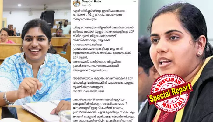'പാര്ട്ടിയെക്കാള് വലുതാണെന്ന് ഭാവമുണ്ടായി; അധികാരപരമായി തന്നേക്കാള് താഴ്ന്നവരോട് പുച്ഛം; കരിയര് ബില്ഡിങ്ങിനുള്ള കോക്കസാക്കി സ്വന്തം ഓഫീസിനെ മാറ്റി; ജനകീയത ഇല്ലാതാക്കിയതാണ് കോര്പറേഷനില് തകരാന് കാരണം'; തിരുവനന്തപുരം കോര്പ്പറേഷനിലെ തിരിച്ചടിക്ക് പിന്നാലെ ആര്യ രാജേന്ദ്രനെതിരെ ആദ്യവെടി പൊട്ടിച്ച് ഗായത്രി ബാബു; വിവാദമായതോടെ ഫേസ്ബുക്ക് പോസ്റ്റ് പിന്വലിച്ചു; സിപിഎമ്മില് അഭിപ്രായ ഭിന്നത