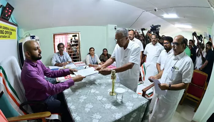 പിണറായിയിലെ അദ്ദേഹത്തിന്റെ വീടിന് സമീപത്തെ പാണ്ട്യാല മുക്കില് നിന്ന് വാഹനപ്രചാരണമായി സബ് റജിസ്ട്രാര് ഓഫിസിലെത്തി പത്രിക സമര്പ്പിക്കാനായിരുന്നു തീരുമാനമെങ്കിലും വാഹന പ്രചാരണം ഒഴിവാക്കി. പ്രവര്ത്തകര് ഉള്പ്പെടെയുള്ളവരുെട വാഹന അകമ്പടിയോടെ റജിസ്ട്രാര് ഓഫിസിലേക്ക് എത്തുകയായിരുന്നു.