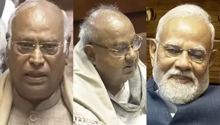 തുടര്ന്ന് മുന് പ്രധാനമന്ത്രി എച്ച്.ഡി. ദേവഗൗഡയെക്കുറിച്ചുള്ള ഖാര്ഗെയുടെ പരാമര്ശമാണ് സഭയെ ചിരിപ്പിച്ചത്. 54 വര്ഷത്തെ ദീര്ഘകാല പരിചയം തങ്ങള് തമ്മിലുണ്ടെന്ന് പറഞ്ഞ ഖാര്ഗെ, ദേവഗൗഡയുടെ രാഷ്ട്രീയ മാറ്റത്തെ രസകരമായി അവതരിപ്പിച്ചു. 'അദ്ദേഹം ഞങ്ങളുമായി ഡേറ്റ് ചെയ്തു, ഞങ്ങളെ സ്നേഹിച്ചു, പക്ഷേ അവസാനം വിവാഹം കഴിച്ചത് പ്രധാനമന്ത്രി നരേന്ദ്ര മോദിയെയാണ്' എന്ന ഖാര്ഗെയുടെ വാക്കുകള് കേട്ട് സഭയിലുണ്ടായിരുന്ന പ്രധാനമന്ത്രി ഉള്പ്പെടെയുള്ളവര് പൊട്ടിച്ചിരിച്ചു. 1996ല് കോണ്ഗ്രസ് പിന്തുണയോടെ പ്രധാനമന്ത്രിയായ ദേവഗൗഡ പിന്നീട് ബിജെപിയുമായി സഖ്യമുണ്ടാക്കിയ പശ്ചാത്തലത്തിലായിരുന്നു ഈ പരിഹാസം. 'എനിക്ക് എച്ച്.ഡി. ദേവഗൗഡയെ 54 വര്ഷത്തിലേറെയായി അറിയാം. ഞങ്ങള് ഒരുമിച്ച് ഒരുപാട് കാലം പ്രവര്ത്തിച്ചിട്ടുണ്ട്. പക്ഷേ പിന്നീട് എന്ത് സംഭവിച്ചുവെന്ന് എനിക്കറിയില്ല,' എന്ന് ഖാര്ഗെ പറഞ്ഞു.