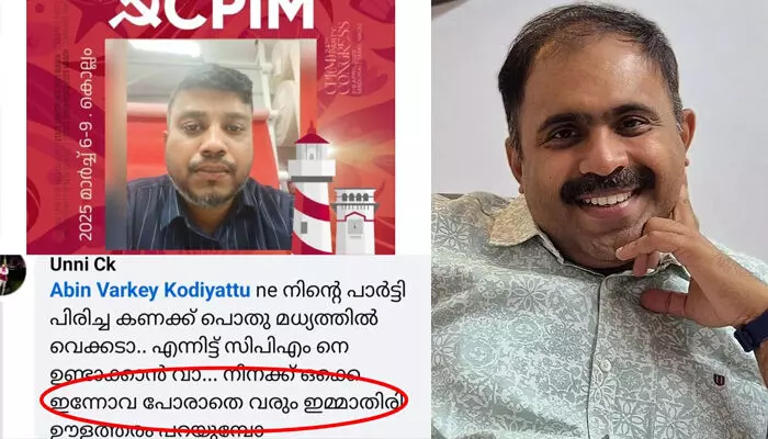 ടി പി ചന്ദ്രശേഖരനെ കൊല്ലാന് വിട്ട ഇന്നോവയാണ് ഉദ്ദേശിച്ചതെങ്കില്, അതിന് ഉണ്ണി മോന് ഇച്ചിരി കൂടെ മൂക്കാനുണ്ട് എന്നാണ് അബിന് വര്ക്കി പറഞ്ഞത്. സിപിഎമ്മിന് എതിരെ എന്ത് പറഞ്ഞാലും ഉടനെ ഇന്നോവ അയയ്ക്കുക എന്നതാണ് അവരുടെ ഭീഷണിയെന്നും പയ്യന്നൂരില് പ്രകടനം നടത്തിയാല് ഉടനെ അവരെ കൈകാര്യം ചെയ്യുക, ആരോപണം ഉന്നയിച്ചാല് ഉടനെ വീടിന് മുന്നില് പടക്കം പൊട്ടിക്കുക തുടങ്ങിയവയാണ് സിപിഎമ്മിന്റെ രീതികളെന്നും അബിന് വര്ക്കി പറഞ്ഞു.