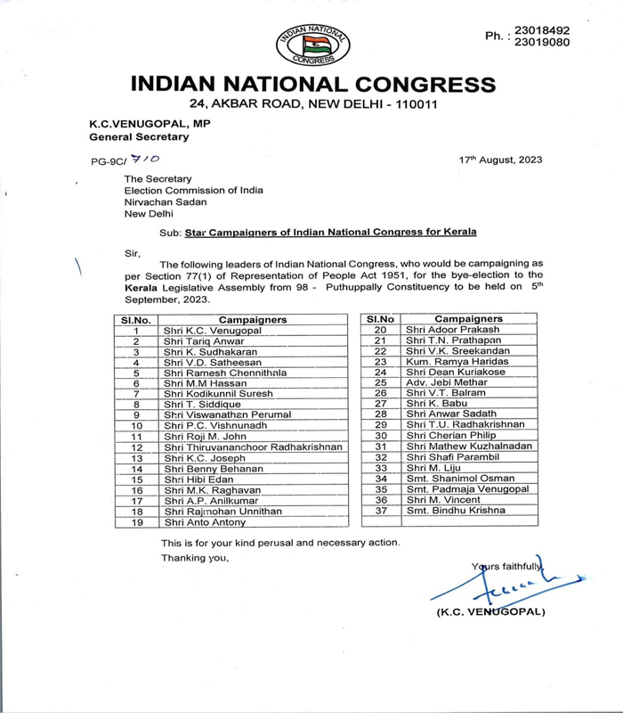 എന്നാൽ, തരൂരിനെ പട്ടികയിൽ കാണാനില്ല. തരൂർ സെപ്റ്റംബർ, 2 നും, 3 നും പുതുപ്പള്ളിയിൽ ചാണ്ടി ഉമ്മന് വേണ്ടി പ്രചാരണം നയിക്കുമെന്ന് നേരത്തെ വ്യക്തമാക്കിയെങ്കിലും അദ്ദേഹം പട്ടികയിൽ ഇടം പിടിച്ചില്ലെന്നാണ് തരൂർ ക്യാമ്പിന്റെ പരാതി. കെ സി വേണുഗോപാലാണ് 37 താരപ്രചാരകരുടെ പട്ടിക കമ്മീഷന് സമർപ്പിച്ചത്. പ്രവർത്തക സമിതി അംഗങ്ങളുടെ പട്ടിക വന്നത് ഓഗസ്റ്റ് 20 നാണ്. കെ സി, തിരഞ്ഞെടുപ്പ് കമ്മീഷന് താരപ്രചാരകരുടെ പട്ടിക സമർപ്പിച്ചത് ഓഗസ്റ്റ് 17 നും. ഖാർഗെയും, രാഹുൽ ഗാന്ധിയും സോണിയ ഗാന്ധിയും അടങ്ങുന്ന ഹൈക്കമാൻഡിന്റെ അന്തിമ പട്ടികയിൽ തരൂരും ഉൾപ്പെടുമെന്ന് കെ സി കരുതിയിരുന്നില്ലേ? എന്തായാലും, തരൂരിനെ താരപ്രചാരകരുടെ പട്ടികയിൽ ഉൾപ്പെടുത്താത്തതിൽ പാർട്ടി പ്രവർത്തകരിലും അമർഷം ഉയരുന്നതായാണ് സൂചന