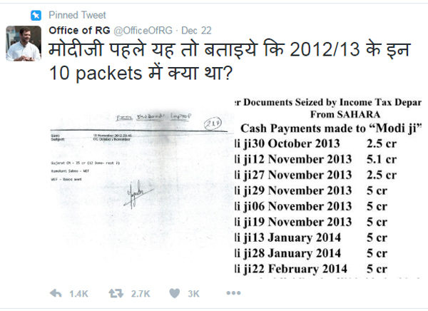 പക്ഷേ, പ്രശ്നം അവിടംകൊണ്ടും തീരുന്നില്ല. മോദിക്ക് ബിർളയും സഹാറയും പണം നൽകിയെന്ന് വ്യക്തമാക്കാൻ ഡയറിയിലെ പരാമർശങ്ങളാണ് രാഹുൽ ഉയർത്തിക്കാട്ടിയത്. അഗസ്റ്റ വെസ്റ്റ് ലാൻഡ് ഇടപാടിൽ കോൺഗ്രസ്സിന് പങ്കാളിത്തമുണ്ടെന്ന ആരോപണം ഉയരുന്നതും ഇത്തരത്തിൽ ഡയറി രേഖകളെ ഉദ്ധരിച്ചാണ്. അഗസ്റ്റ ഡീലിൽ മധ്യസ്ഥത വഹിച്ചയാളുടെ ഡയറിയിലെ കുറിപ്പുകൾ ആധാരമാക്കിയാണ് ആംആദ്മിയും ബിജെപിയും കോൺഗ്രസ്സിനെ പ്രതിക്കൂട്ടിൽ നിർത്തിയിട്ടുള്ളത്.