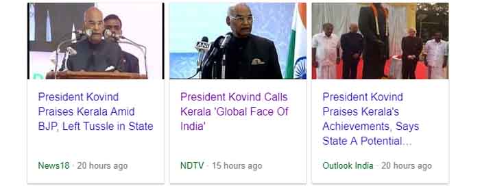 എന്നാൽ ആ കുപ്രചരണങ്ങൾ ഒറ്റയടിക്ക് ഇല്ലാതാക്കുന്നതായി രണ്ടുദിവസത്തെ കേരള സന്ദർശനത്തിന് എത്തിയ രാഷ്ട്രപതി രാംനാഥ് കോവിന്ദിന്റെ പ്രസംഗം. കേരളത്തിന് എതിരെ ബിജെപി ഉന്നയിച്ച ആരോപണങ്ങൾ നിരന്തരം നൽകിയ ദേശീയ മാധ്യമങ്ങളെല്ലാം വലിയ പ്രാധാന്യത്തോടെ രാഷ്ട്രപതിയുടെ കേരളത്തെ ശ്ളാഘിച്ചുള്ള പ്രസംഗവും റിപ്പോർട്ടു ചെയ്തിരിക്കുകയാണ്. ദേശീയ പത്രങ്ങളിലും ചാനലുകളിലുമെല്ലാം കേരളം സമസ്തമേഖലകളിലും മുന്നേറിയ സംസ്ഥാനമാണന്ന രാംനാഥ് കോവിന്ദിന്റെ വാക്കുകൾ നിറഞ്ഞതോടെ ബിജെപി കടുത്ത പ്രതിരോധത്തിലുമായി.