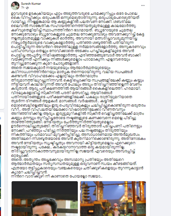 എത്രയോ തട്ടിപ്പുകാരെയും വഞ്ചകരെയും ചതിക്കുഴികളെയും തുറന്നുകാട്ടാൻ ക്യാമറ ചലിപ്പിച്ചവനായിട്ടും നിന്റെ വാരിക്കുഴി നീ കാണാതെ പോയല്ലോ സജയാ... എന്നാണ് പി ജി സുരേഷ്കുമാർ ഫേസ്ബുക്കിൽ എഴുതിയത്. ഉറ്റവരുടെ ഉദകക്രിയയും ഏറ്റം അടുത്തവരുടെ ചരമക്കുറിപ്പും ഒരേ പോലെ കൈ വിറപ്പിക്കും എന്നു പറഞ്ഞു കൊണ്ടാണ് സുരേഷ്കുമാർ ഫേസ്ബുക്കിൽ എഴുതിയത്.