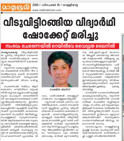 {{ശാസ്താംകോട്ട: മാര്ക്ക് കുറഞ്ഞതില് അച്ഛന്റെ വഴക്ക് പേടിച്ച് വീടുവിട്ടിറങ്ങിയ പ്ലസ്ടു വിദ്യാര്ഥി ചെന്നൈയില് റെയില്വേയുടെ വൈദ്യുത ലൈനില്നിന്ന് ഷോക്കേറ്റ് മരിച്ചു. ശൂരനാട് ചക്കുവള്ളി വഴിയുടെ വടക്കതില് വര്ഗീസ്-റീന ദമ്പതിമാരുടെ മകന് റോബിന് വര്ഗീസാ(17)ണ് മരിച്ചതായി ബന്ധുക്കള്ക്ക് വിവരം ലഭിച്ചത്.