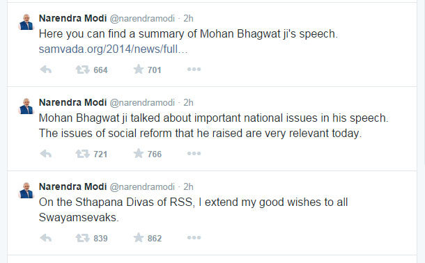 തന്റെ സർക്കാരിനെ സാക്ഷാൽ മോഹൻ ഭാഗവത് പ്രകീർത്തിക്കുന്നു. മോദിയും അതു തന്നെ തിരിച്ച് ചെയ്തു. ദേശീയ പ്രാധാന്യമുള്ള വിഷയങ്ങളാണ് മോഹൻ ഭാഗവത് വിജയദശമി ദിനത്തിൽ ഉയർത്തുന്നതെന്ന് മോദി ചൂണ്ടിക്കാട്ടുന്നു. സാമൂഹിക പരിഷ്കരണത്തിനായി ആർഎസ്എസ് തലവൻ മുന്നോട്ട് വയ്ക്കുന്ന നിർദ്ദേശങ്ങൾക്ക് വർത്തമാനകാലത്ത് പ്രസക്തി ഏറെയാണെന്നാണ് മോദിയുടെ നിലപാട്. ഭാഗവത്തിന്റേത് ഹിന്ദുത്വ അജണ്ടയാണെന്ന പ്രതിപക്ഷ ആരോപണത്തിന് ട്വിറ്ററിലൂടെയാണ് പ്രധാനമന്ത്രി മറുപടി നൽകുന്നത്. വിമർശിക്കുന്നവർക്ക് വായിക്കാനായെന്നോണം ഭാഗവത്തിന്റെ പ്രസംഗത്തിന്റെ പൂർണ്ണ രൂപം കിട്ടുന്ന ലിങ്കും മോദി ട്വിറ്ററിലിട്ടിട്ടുണ്ട്.