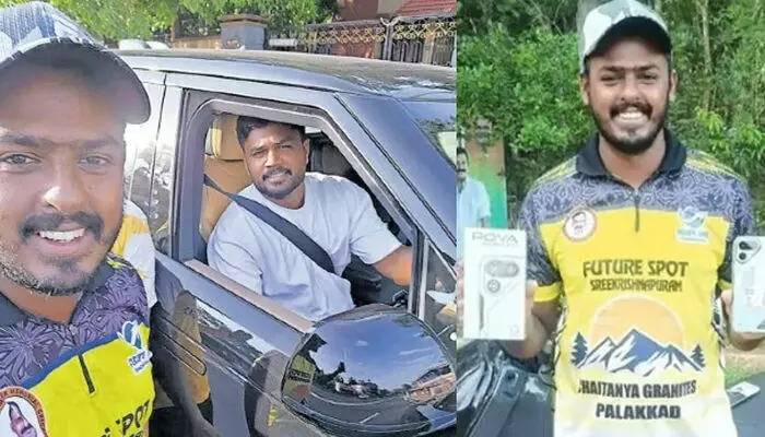 പാലക്കാട്: മൈതാനത്തെ സിക്സറുകൾ പോലെ അപ്രതീക്ഷിതമായിരുന്നു ആ സമ്മാനം. തന്റെ പ്രിയതാരത്തെ ഒന്ന് നേരിൽ കാണാൻ ആഗ്രഹിച്ച കടമ്പഴിപ്പുറം സ്വദേശി ശബരീഷിന് ലഭിച്ചത് ജീവിതത്തിലൊരിക്കലും മറക്കാനാവാത്ത ഒരു 'സഞ്ജു മൊമന്റ്'. കേടായ ഡിസ്പ്ലേയുള്ള ഫോണിൽ സെൽഫിയെടുത്ത ആരാധകന് പുത്തൻ സ്മാർട്ട് ഫോൺ സമ്മാനിച്ചാണ് മലയാളി ക്രിക്കറ്റ് താരം സഞ്ജു സാംസൺ മടങ്ങിയത്.