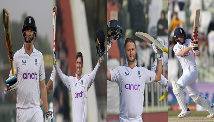 ജോ റൂട്ട് നിരാശപ്പെടുത്തിയെങ്കിലും പിന്നാലെ വന്ന ഒലി പോപ്പും ഹാരി ബ്രൂക്കും സെഞ്ചുറികൾ നേടി.80 പന്തിലാണ് ബ്രൂക്ക് സെഞ്ചുറി തികച്ചത്.പാക് സ്പിന്നറായ സൗദ് ഷക്കീലിനെ ഒരോവറിൽ ആറു ഫോറടിച്ച് ബ്രൂക്ക് ഇംഗ്ലണ്ടിന്റെ അതിവേഗ ടെസ്റ്റ് സെഞ്ചുറിക്ക് അരികിലെത്തിയെങ്കിലും 90കളിൽ വേഗം കുറഞ്ഞതോടെ അതിവേഗ സെഞ്ചുറിയുടെ റെക്കോർഡ് കൈവിട്ടു.