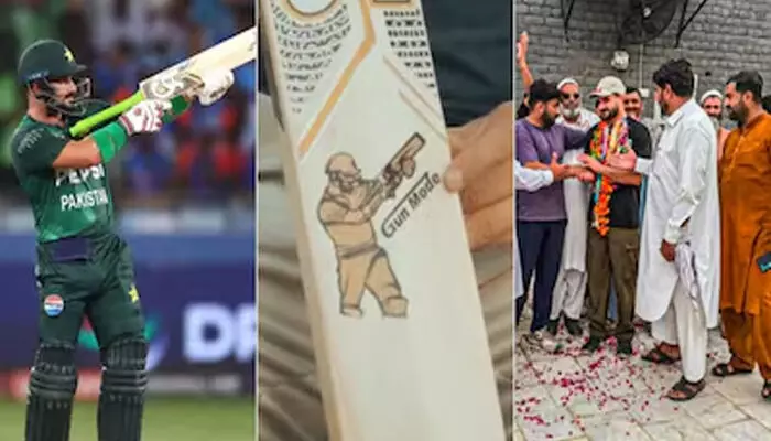 ബാറ്റിൽ 'ഗൺ മോഡ്' സ്റ്റിക്കർ പതിപ്പിച്ച് നൽകി ഊഷ്മള സ്വീകരണം; ഏഷ്യാ കപ്പിലെ വിവാദമായ 'ഗൺ ഷോട്ട്' സെലിബ്രേഷനിൽ ആരാധകർ ഹാപ്പി; പാക്കിസ്ഥാൻ ബാറ്റർ സാഹിബ്സാദ ഫർഹാൻ നാട്ടിൽ 'ഹീറോ'
