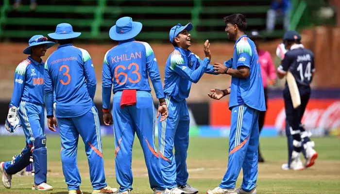 ബുലവായോ: അണ്ടര് 19 ലോകകപ്പില് അമേരിക്കയ്ക്കെതിരെ ആറ് വിക്കറ്റിന് തകർത്ത് ഇന്ത്യക്ക് വിജയത്തുടക്കം. സിംബാബ്വെയിലെ ബുലവായോയിൽ നടന്ന മത്സരത്തിൽ, മഴയെ തുടർന്ന് 37 ഓവറിൽ 96 റൺസായി പുനർനിശ്ചയിച്ച വിജയലക്ഷ്യം ഇന്ത്യ 17.2 ഓവറിൽ നാല് വിക്കറ്റ് നഷ്ടത്തിൽ മറികടന്നു. അഞ്ച് വിക്കറ്റ് പ്രകടനത്തിലൂടെ അമേരിക്കയെ 107 റൺസിന് ഒതുക്കിയ ഹെനില് പട്ടേലും, പുറത്താകാതെ 42 റൺസ് നേടി ഇന്ത്യയെ വിജയത്തിലെത്തിച്ച അഭിഗ്യാന് കുണ്ടുവും ഇന്ത്യൻ വിജയത്തിൽ നിർണായക പങ്ക് വഹിച്ചു. അഞ്ച് വിക്കറ്റ് സ്വന്തമാക്കിയ ഇന്ത്യൻ പേസർ ഹെനിൽ പട്ടേലാണ് കളിയിലെ താരം.