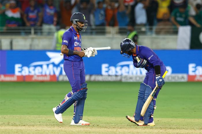 നവാസിനെ തുടർച്ചയായ സിക്സർ പറത്താനുള്ള ശ്രമത്തിൽ ബൗണ്ടറി ലൈനിൽ കുടുങ്ങുകയായിരുന്നു. സമാനമായ ഷോട്ട് കളിക്കാൻ ശ്രമിച്ച കോഹ് ലിയും നവാസിന് മുന്നിൽ കുടുങ്ങി. സൂര്യകുമാർ യാദവും (18) നിരാശപ്പെടുത്തി. എന്നാൽ, ഉത്തരവാദിത്തത്തോടെ കളിച്ച ഹാർദികും ജദേജയും ഇന്ത്യയെ വിജയത്തിലേക്ക് നയിച്ചു. ജയിക്കാൻ ഏഴു റൺസ് വേണ്ടിയിരിക്കെ അവസാന ഓവറിൽ ജദേജയുടെ കുറ്റിതെറിച്ചെങ്കിലും നാലാം പന്തിൽ സിക്സറടിച്ച് ഹാർദിക് പാണ്ഡ്യ ദൗത്യം പൂർത്തിയാക്കുകയായിരുന്നു.
