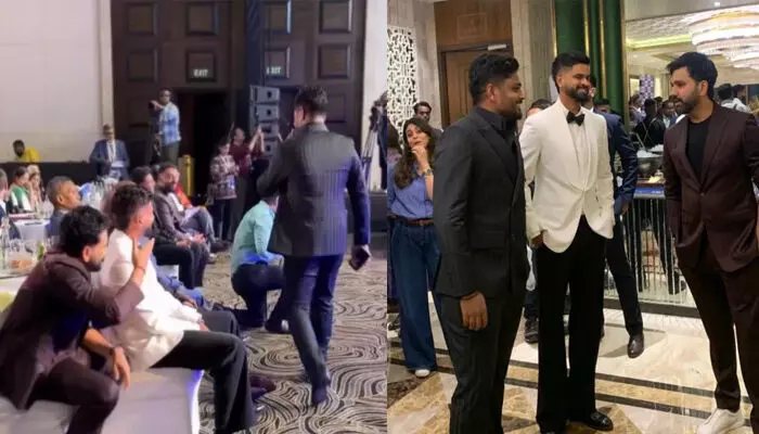 മലയാളി താരം സഞ്ജു സാംസണിനെ രോഹിത് ശര്മ അനുകരിക്കുന്നതാണ് വീഡിയോയിലുള്ളത്. രോഹിത് ശര്മയും ശ്രേയസ്സ് അയ്യരും സദസ്സില് ഇരിക്കുന്നതും സഞ്ജു സാംസണ് അവരുടെ മുന്നിലൂടെ കടന്നുപോകുന്നതും വീഡിയോയില് കാണാം. സഞ്ജു നടന്നുപോയതിന് പിന്നാലെ മലയാളി താരത്തിന്റെ നടത്തം രോഹിത് അനുകരിച്ചു. അടുത്തിരുന്ന അയ്യരോട് രോഹിത് ഇക്കാര്യം പങ്കുവെക്കുകയും ചെയ്തു. ഇരുവരും തമാശ പങ്കിട്ട് ചിരിക്കുന്നത് ക്യാമറയില് പതിയുകയും ചെയ്തു.