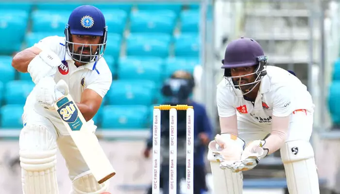 3ന് 35 എന്ന നിലയില് മൂന്നാം ദിനം ബാറ്റിങ് ആരംഭിച്ച കേരളത്തിന്, ആദ്യ സെഷന്റെ തുടക്കത്തില് തന്നെ സച്ചിന് ബേബിയുടെ (7) വിക്കറ്റ് നഷ്ടമായി. രാമകൃഷ്ണ ഘോഷിന്റെ പന്തില് വിക്കറ്റ് കീപ്പര് സൗരഭ് നവാലെ കിടിലന് ക്യാച്ചിലൂടെയാണ് സച്ചിനെ പുറത്താക്കിയത്. എന്നാല് അഞ്ചാം വിക്കറ്റില് ഒന്നിച്ച സഞ്ജു അസ്ഹറുദ്ദീന് കൂട്ടുകെട്ട് നിര്ഭയം ബാറ്റുവീശി കേരളത്തെ മുന്നോട്ടു നയിച്ചു. അഞ്ചാം വിക്കറ്റില് ഇരുവരും ചേര്ന്ന് 57 റണ്സാണ് കൂട്ടിച്ചേര്ത്തത്. അര്ധസെഞ്ചറിക്കു പിന്നാലെ സഞ്ജുവിനെ പുറത്താക്കി വിക്കി ഓസ്വാളാണ് കൂട്ടുകെട്ട് പൊളിച്ചത്. 63 പന്തില് 54 റണ്സെടുത്ത സഞ്ജുവിന്റെ ബാറ്റില്നിന്ന് ഒരു സിക്സും അഞ്ച് ഫോറുമാണ് പിറന്നത്.