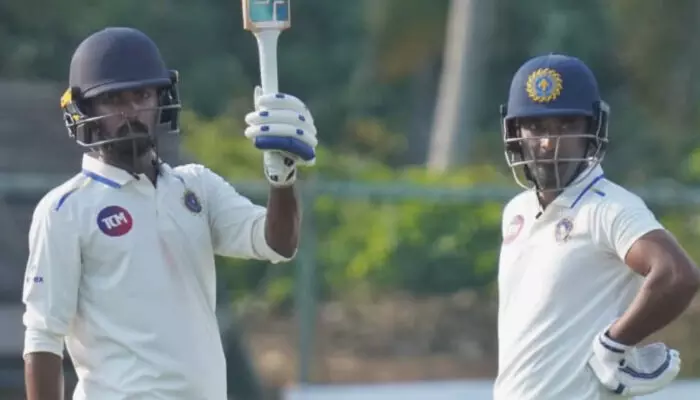 7-3 എന്ന സ്കോറില് പതറിയ സൗരാഷ്ട്രയെ ജേ ഗോഹില് ഒറ്റക്ക് കരകയറ്റി. മറുവശത്ത് 47 പന്ത് നേരിട്ട് 13 റണ്സെടുത്ത പ്രേരക് മങ്കാദ് പിടിച്ചു നിന്നതോടെ കൂടുതല് നഷ്ടങ്ങളില്ലാതെ സൗരാഷ്ട്ര 50 കടന്നു. എന്നാല് സ്കോര് 76ല് നില്ക്കെ പ്രേരക് മങ്കാദിനെ(13) മടക്കിയ നിധീഷ് തന്നെ കൂട്ടുകെട്ട് പൊളിച്ചു. 69 റണ്സാണ് പ്രേരങ്ക് മങ്കാദും ഗോഹിലും ചേര്ന്ന് നാവാം വിക്കറ്റ് കൂട്ടുകെട്ടില് നേടിയത്. പിന്നാലെ ക്രീസിലെത്തിയ അന്ഷ് ഗോസായിയെ(1) ക്യാപ്റ്റന് മുഹമ്മദ് അസറുദ്ദീന്റെ കൈകളിലെത്തിച്ച നിധീഷ് അഞ്ച് വിക്കറ്റ് തികച്ചതോടെ സൗരാഷ്ട്ര കൂട്ടത്തകര്ച്ചയിലായി. ഗജ്ജാര് സമ്മറിനെ(23)കൂട്ടുപിടിച്ച് ജേ ഗോഹില് സൗരാഷ്ട്രയെ 100 കടത്തിയെങ്കിലും ജേ ഗോഹിലിനെ(84) പുറത്താക്കി ഏദന് ആപ്പിള് ടോം കൂട്ടുകെട്ട് പൊളിച്ചു.