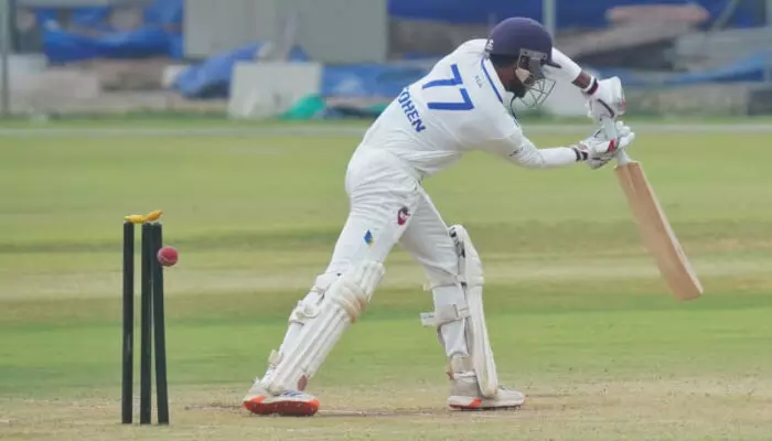 രണ്ട് വിക്കറ്റ് നഷ്ടത്തില് 82 റണ്സെന്ന നിലയില് രണ്ടാം ദിനം ബാറ്റിങ് ആരംഭിച്ച കേരളത്തിനെ രോഹന് കുന്നുമ്മലും അഹമ്മദ് ഇമ്രാനും ചേര്ന്ന് നൂറുകടത്തി. എന്നാല് കേരളം 21 റണ്സ് കൂട്ടിച്ചേര്ത്തതിന് പിന്നാലെ ഇമ്രാന് പുറത്തായി. 10 റണ്സാണ് താരത്തിന്റെ സമ്പാദ്യം. നാലാം വിക്കറ്റില് ബാബ അപരാജിതുമായി ചേര്ന്നാണ് രോഹന് കുന്നുമ്മല് ഇന്നിങ്സ് മുന്നോട്ടുനയിച്ചത്. പിന്നാലെ 80 റണ്സെടുത്ത് രോഹനും ഡക്കായി ക്യാപ്റ്റന് അസറുദ്ദീനും കൂടാരം കയറി. അതോടെ കേരളം 136-5 എന്ന നിലയിലായി.