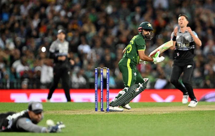 എന്നാൽ അർധസെഞ്ചുറി നേടിയതിനുപിന്നാലെ ബാബർ പുറത്തായി. ബോൾട്ടിന്റെ പന്തിൽ സിക്സടിക്കാനുള്ള ബാബറിന്റെ ശ്രമം ഡാരിൽ മിച്ചലിന്റെ കൈയിൽ അവസാനിച്ചു. 42 പന്തുകളിൽ നിന്ന് ഏഴ് ഫോറിന്റെ സഹായത്തോടെ 53 റൺസെടുത്താണ് ബാബർ മടങ്ങിയത്. ബാബറിന് പകരം മുഹമ്മദ് ഹാരിസാണ് ക്രീസിലെത്തിയത്.
