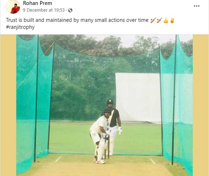 വിശ്വാസ്യത എന്നത് നിർമ്മിതിയാണ്; ഒരു പാട് ചെറിയ പ്രവർത്തികളിലൂടെ കാലങ്ങളോളം കാത്തു സൂക്ഷിക്കേണ്ടതും; ഫെയ്സ് ബുക്കിൽ കുറിച്ചത് 37-ാം വയസ്സിൽ ബാറ്റ് വീശി തെളിയിച്ച് കേരളാ ക്രിക്കറ്റിലെ വന്മതിൽ; സച്ചിന്റെ മടയിലിരുന്ന് ഗവാസ്കറുടെ ഉപദേശം കേട്ട പയ്യൻ വീണ്ടും വിസ്മയമായി; രഞ്ജിയിലെ തിരിച്ചു വരവിൽ ഓപ്പണറായി മിന്നിച്ച് റോഹൻ പ്രേം; സഞ്ജുവിന് ചേട്ടനെ കിട്ടുമ്പോൾ