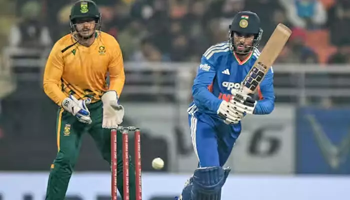 കൂറ്റന് വിജയലക്ഷ്യം പിന്തുടര്ന്ന ഇന്ത്യക്ക് ആദ്യ ഓവറില്ത്തന്നെ ലുങ്കി എന്ഗിഡിയുടെ പന്തില് ശുഭ്മാന് ഗില് ഗോള്ഡന് ഡക്കായത് കനത്ത തിരിച്ചടിയായി. തുടര്ച്ചയായ രണ്ടാം ടി20-യിലും ഗില്ലിന് ഫോമിലേക്കുയരാനായില്ല. സ്വതസിദ്ധ ശൈലിയില് ബാറ്റുവീശിയ അഭിഷേക് ശര്മ തൊട്ടടുത്ത ഓവറിലും പുറത്തായതോടെ ഇന്ത്യയുടെ പ്രതീക്ഷകള്ക്ക് മങ്ങലേറ്റു. എട്ടു പന്തില് രണ്ട് സിക്സ് സഹിതം 17 റണ്സാണ് അഭിഷേകിന്റെ സമ്പാദ്യം. നാലാം ഓവറില് ക്യാപ്റ്റന് സൂര്യകുമാര് യാദവും (5) പുറത്തായതോടെ ഇന്ത്യ പ്രതിരോധത്തിലായി.എങ്കിലും ഒരറ്റത്ത് തിലക് വര്മ സ്കോര് ഉയര്ത്തിക്കൊണ്ടിരുന്നു. എട്ടാം ഓവറില് അക്സറും(21 പന്തില് 21) വീണതോടെ ഇന്ത് 67-4ലേക്ക് വീണു.