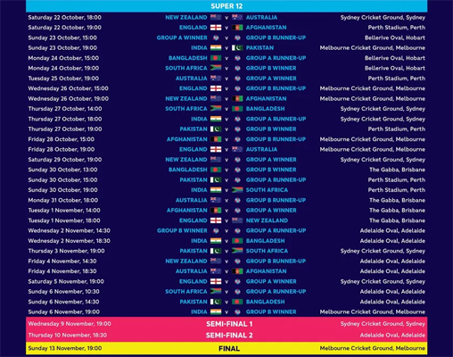 ശ്രീലങ്കയു നമീബിയയും തമ്മിലുള്ള പോരാട്ടത്തോടെയാണ് ടി20 ലോകകപ്പിന്റെ എട്ടാം അധ്യായത്തിന് തുടക്കമാകുക.ഇന്ത്യൻ സമയം രാവിലെ 9.30 നും ഉച്ചയ്ക്ക് 1.30 നുമായാണ് മത്സരങ്ങൾ നടക്കുക.23 ന് പാക്കിസ്ഥാനെതിരെയാണ് ഇന്ത്യയുടെ ആദ്യ മത്സരം. ഉച്ചയ്ക്ക് 1.30 മുതലാണ് മത്സരം.ഒക്ടോബർ 16 ന് തുടങ്ങി നവംബർ 13 ന് അവസാനിക്കുന്ന രീതിയിലാണ് ഇത്തവണ ടൂർണ്ണമെന്റ്.