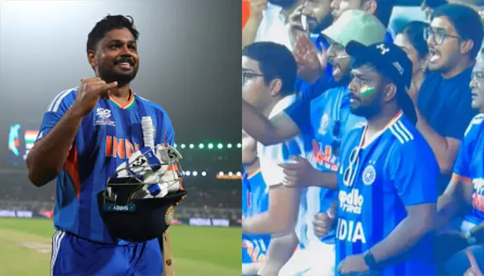 മുംബൈ: ടി20 ലോകകപ്പ് സെമി ഫൈനലിൽ ഇംഗ്ലണ്ടിനെ തകർത്ത് ഇന്ത്യ ഫൈനലിൽ പ്രവേശിച്ചപ്പോൾ വാംഖഡെ സ്റ്റേഡിയത്തിൽ ആരാധകർ അമ്പരന്നത് മറ്റൊരു കാഴ്ച കണ്ടാണ്. ക്രീസിൽ ബാറ്റിംഗ് വെടിക്കെട്ടുമായി മലയാളി താരം സഞ്ജു സാംസൺ നിറഞ്ഞാടിയപ്പോൾ, ഗാലറിയിൽ സഞ്ജുവിനെ അമ്പരപ്പിക്കുന്ന വിധം സാമ്യമുള്ള ഒരാൾ! സഞ്ജു വിക്കറ്റ് തെറിപ്പിച്ച ആവേശത്തിൽ തുള്ളിച്ചാടുന്ന ഈ 'അപരന്റെ' ദൃശ്യങ്ങൾ സമൂഹമാധ്യമങ്ങളിൽ നിമിഷങ്ങൾക്കകം വൈറലായി.