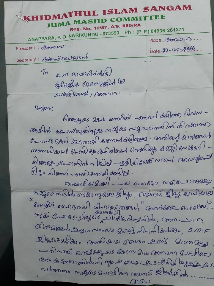 അതേസമയം പാണക്കാട്് തങ്ങൾക്കെതിരെ ലബീബ് ഇട്ട അതേ പോസ്റ്റ് മെയ് 20ന് മഹല്ല് സെക്രട്ടറി അഷ്റഫ് പൈക്കാടൻ തന്നെ സ്വന്തം വാളിൽ ഷെയർ ചെയ്തതിന്റെ സ്ക്രീൻഷോട്ട് സോഷ്യൽ മീഡിയയിൽ വൈറലാകാൻ തുടങ്ങി. ലബീബിന്റെ കുടുംബത്തിനെതിരെ കത്ത് നൽകിയ സെക്രട്ടറി തന്നെ പോസ്റ്റ് ഷെയർ ചെയ്തത് നാട്ടിലും ചർച്ചാ വിഷയമായിട്ടുണ്ട്. അതേസമയം ഷെയർ ചെയ്തതുമായി ബന്ധപ്പെട്ട് വ്യക്തമായ മറുപടി മഹല്ല് സെക്രട്ടറി അഷ്റഫ് പൈക്കാടന് പറയാനുണ്ടായിരുന്നില്ല. ലബീബിന് ഐക്യദാർഢ്യം പ്രഖ്യാപിച്ചിട്ടോ ഹൈദരലി തങ്ങളെ വിമർശിച്ചിട്ടോ അല്ല താൻ പോസ്റ്റ് ഷെയർ ചെയ്തതെന്നും കൈ തട്ടി ഷെയർ ആവുകയായിരുന്നുവെന്നും മഹല്ല് സെക്രട്ടറി അഷ്റഫ് പൈക്കാടൻ മറുനാടൻ മലയാളിയോടു പറഞ്ഞു.