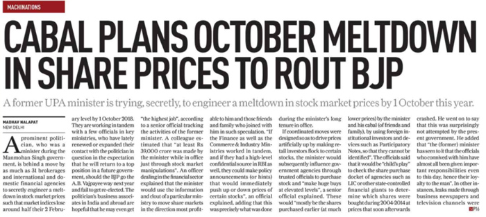 മോദി സർക്കാരിനെ വീഴ്ത്താൻ ഓഹരിവിപണിയിൽ 'ഒക്ടോബർ ദുരന്തം' ആസൂത്രണം ചെയ്ത് മുൻ കേന്ദ്രമന്ത്രി; യുപിഎ അധികാരത്തിൽ എത്തിയാൽ ഉന്നതപദവി നൽകാമെന്ന പ്രലോഭനത്തിൽ മയങ്ങി മുതിർന്ന ഉദ്യോഗസ്ഥർ; ചരടുവലികളിലൂടെ ഓഹരിവിപണിയെ നിയന്ത്രിച്ച് ഈ ഉന്നത രാഷ്ട്രീയ നേതാവും ബന്ധുമിത്രാദികളും നേടിയത് 39,000 കോടി രൂപയെന്നും റിപ്പോർട്ട്