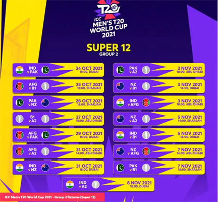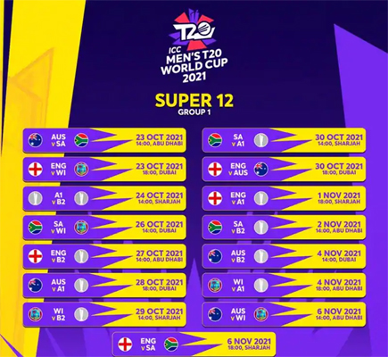 ഒക്ടോബർ 23ന് ആണ് ചാമ്പ്യൻഷിപ്പിന് തുടക്കമാകുക. ഓസ്ട്രേലിയയും സൗത്ത് ആഫ്രിക്കയും തമ്മിലാണ് സൂപ്പർ 12 ഗ്രൂപ്പ് 1ലെ ആദ്യ മത്സരം. അബുദാബിയിലാണ് ഓസീസ്-സൗത്ത് ആഫ്രിക്ക പോര്.ഒക്ടോബർ 23ന് നടക്കുന്ന രണ്ടാമത്തെ മത്സരത്തിൽ വെസ്റ്റ് ഇൻഡീസിനെ ഇംഗ്ലണ്ട് നേരിടും. ദുബായിലാണ് ഇവരുടെ പോര്. ഇന്ത്യയും പാക്കിസ്ഥാനും തമ്മിലാണ് ഗ്രൂപ്പ് ബിയിലെ ആദ്യ മത്സരം. ഒക്ടോബർ 24ന് ദുബായിലാണ് വൈരികൾ പോരിനിറങ്ങുന്നത്.