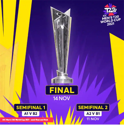 നവംബർ 10ന് അബുദാബിയിലാണ് ആദ്യ സെമി ഫൈനൽ. നവംബർ 11ന് ദുബായിൽ രണ്ടാമത്തെ സെമി ഫൈനലും. രണ്ട് സെമി ഫൈനലിനും റിസർവ് ഡേയുണ്ട്. നവംബർ 14നാണ് കലാശപ്പോര്. ദുബായിൽ പ്രാദേശിക സമയം 6നാണ് മത്സരം. തിങ്കളാഴ്ചയാണ് ഫൈനലിന്റെ റിസർവ് ഡേ.ഇന്ത്യ വേദിയാവേണ്ടിയിരുന്ന ടൂർണമെന്റ് കോവിഡ് പശ്ചാത്തലത്തിലാണ് യുഎഇയിലേക്കും ഒമാനിലേക്കും മാറ്റിയത്. 2016ന് ശേഷം ഇതാദ്യമായാണ് ടി20 ലോകകപ്പ് നടക്കുന്നത് എന്ന പ്രത്യേകതയുണ്ട്. അന്ന് ഇംഗ്ലണ്ടിനെ തോൽപിച്ച് വിൻഡീസ് കിരീടം നേടിയിരുന്നു.
