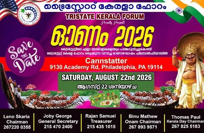 ഫിലാഡല്ഫിയ: ട്രൈസ്റ്റേറ്റ് കേരള ഫോറത്തിന്റെ നേതൃത്വത്തില് ഈ വര്ഷത്തെ ഓണം ആഘോഷം ആഗസ്റ്റ് 22-ാം തീയതി ശനിയാഴ്ച ഫിലഡല്ഫിയയിലെ കാന്സ്റ്റാറ്റര് വോള്ക്സ്ഫെസ്റ്റ് വെറൈന് (Cannstatter), 9130 Academy Road, PA 19114 ഓഡിറ്റോറിയത്തില്നടത്തപ്പെടുമെന്ന് സംഘാടക സമിതി അറിയിച്ചു.