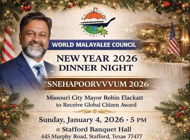 ഹൂസ്റ്റണ്, ടെക്സാസ്:വേള്ഡ് മലയാളി കൗണ്സില് (WMC) 'സ്നേഹപൂര്വ്വം 2026'' എന്ന പേരില് പുതുവത്സര 2026 ഡിന്നര് നൈറ്റ് 2026 ജനുവരി 4-ന് (ഞായര്) വൈകിട്ട് 5:00 മണിക്ക് ടെക്സാസിലെ സ്റ്റാഫോര്ഡിലുള്ള സ്റ്റാഫോര്ഡ് ബാങ്ക്വറ്റ് ഹാളില് സംഘടിപ്പിക്കുന്നു.