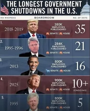 വാഷിംഗ്ടണ്:ചൊവ്വാഴ്ചത്തെ ഷട്ട്ഡൗണ് 1995-1996 കാലത്തെ ഷട്ട്ഡൗണ് യുണൈറ്റഡ് സ്റ്റേറ്റ്സ് ചരിത്രത്തിലെ രണ്ടാമത്തെ ദൈര്ഘ്യമേറിയ ഷട്ട്ഡൗണിന് തുല്യമാക്കി. ഒക്ടോബര് 22 ബുധനാഴ്ച വരെ ഷട്ട്ഡൗണ് തുടര്ന്നാല്, 22 ദിവസങ്ങളുള്ള രണ്ടാമത്തെ ദൈര്ഘ്യമേറിയ ഷട്ട്ഡൗണായി ഇത് മാറും, ട്രംപിന്റെ ആദ്യ ഭരണകാലത്ത് 2017-ല് 35 ദിവസത്തെ ഷട്ട്ഡൗണിന് പിന്നില്.