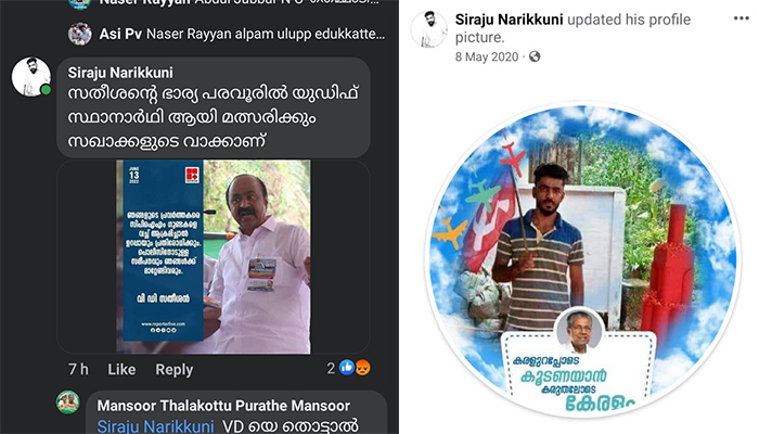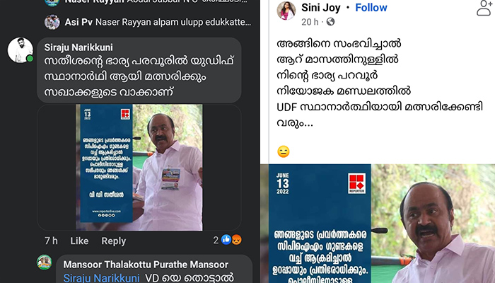 'അങ്ങനെ സംഭവിച്ചാൽ ആറ് മാസത്തിനുള്ളിൽ നിന്റെ ഭാര്യ പറവൂർ നിയോജക മണ്ഡലത്തിൽ യുഡിഎഫ് സ്ഥാനാർത്ഥിയായി മത്സരിക്കേണ്ടി വരും. സഖാക്കളുടെ വാക്കാണ്' എന്നായിരുന്നു സാമൂഹ്യ മാധ്യമങ്ങളിൽ സിപിഎം സൈബർ സഖാക്കൾ കുറിച്ചത്. സിറാജ് നരിക്കുനി, ഷിനി ജോയ് എന്നി പേരുകളിലുള്ള അക്കൗണ്ടുകളിൽ നിന്നുമാണ് സന്ദേശം.